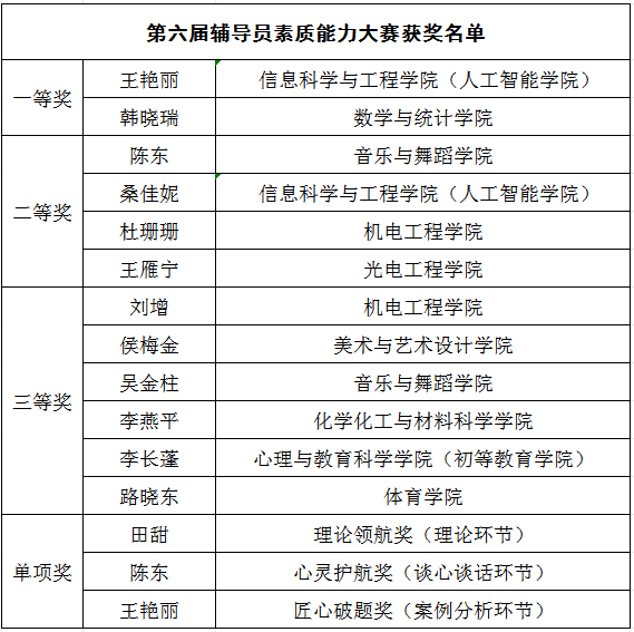 参赛辅导员以饱满的精神状态、务实的工作思路、沉稳的现场表现,充分展现了新时代高校辅导员的责任担当与专业素养,全面彰显了我校辅导员队伍过硬的业务能力与良好精神风貌。经过激烈角逐,获奖名单如下: