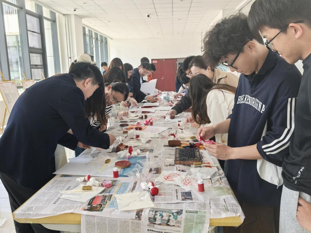 讲座之后,领导、嘉宾与师生移步报告厅外,观看了入选《山东省珍贵古籍名录》的古籍珍品展板,体验了雕版印刷、瓦当拓印非遗技艺。