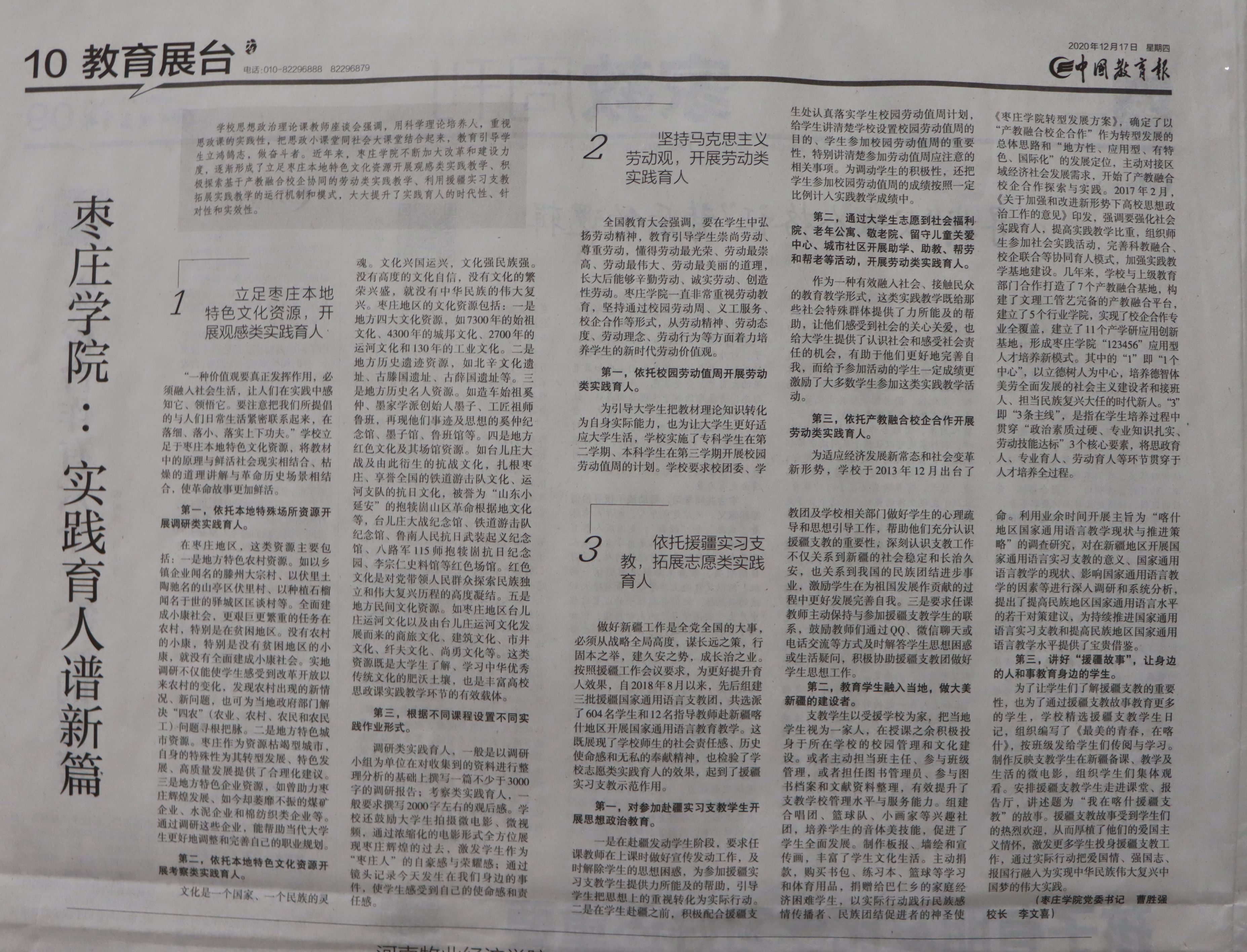 近日,《中国教育报》第10版刊发我校党委书记曹胜强、校长李文喜署名文章《304am永利集团官网:实践育人谱新篇》,从“立足枣庄本地特色文化资源,开展观感类实践育人”“坚持马克思主义劳动观,开展劳动类实践育人”“依托援疆实习支教,拓展志愿类实践育人”三个方面,全面介绍了我校实践育人开展情况及相关经验做法。