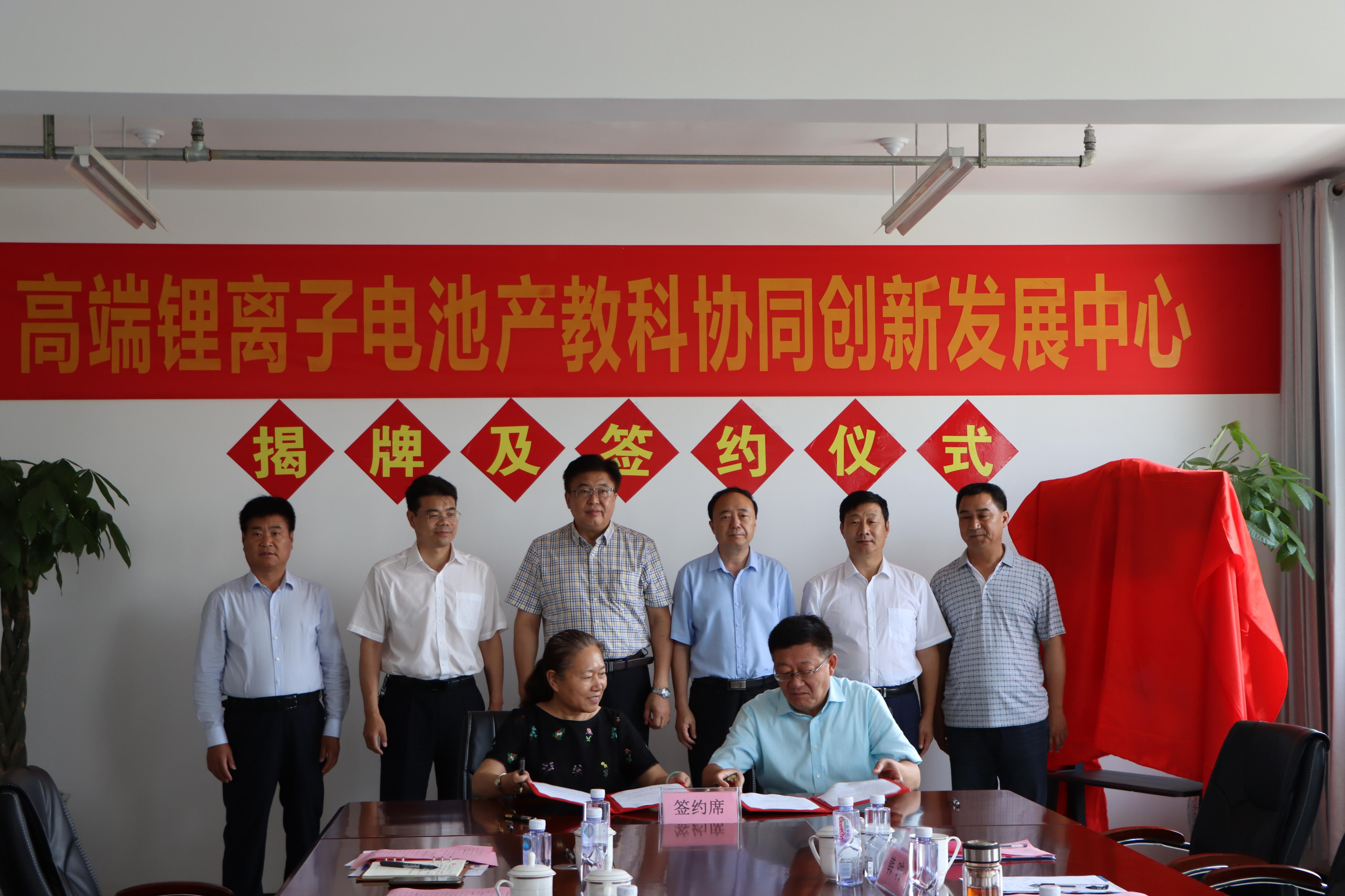 曹胜强与周宗安共同为304am永利集团官网-山东天瀚新能源科技有限公司“高端锂离子电池产教科协同创新发展中心”揭牌,李丽清代表我校与山东天瀚新能源科技有限公司总经理陈凡伟签署合作协议。
