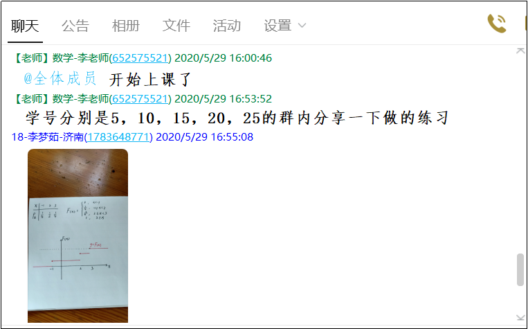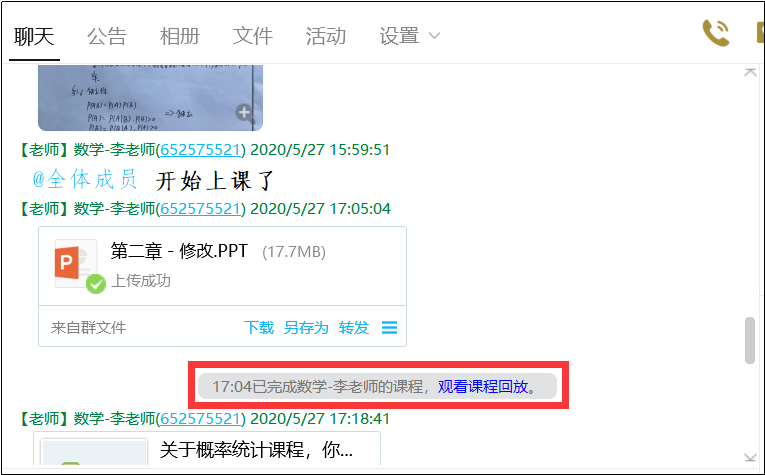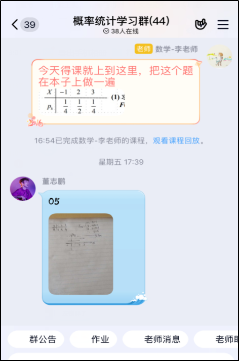 课堂教学主要采用腾讯QQ群直播功能,进行面对面课堂教学,学生上课效率较高。上课时,注重强调每个章节的重难点,上课前十分钟先引导学生回顾上节课学习内容,然后讲授新知识。课堂教学过程中采用随机抽查测试的方式,测试学生的知识掌握情况。对于特殊原因导致确实无法参加群课堂直播的学生,QQ群内生成课堂回放,可以及时回顾课程。