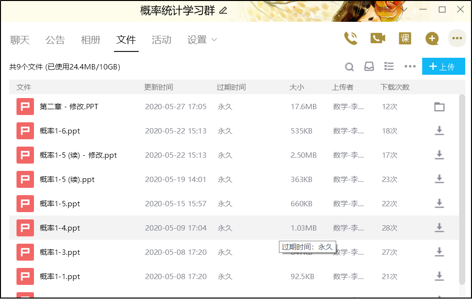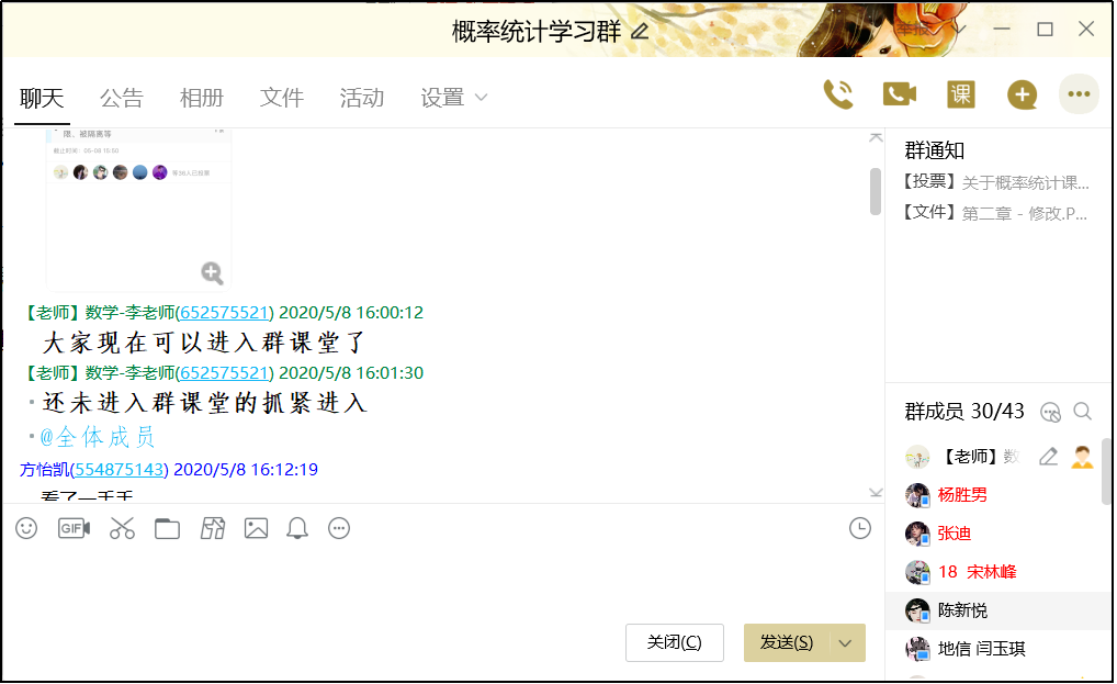 《概率统计》是旅游与资源环境学院2018级地理信息科学专业的基础课程之一,该课程是一门研究和探索客观世界随机现象规律的数学学科,旨在培养学生运用概率统计方法分析问题和解决实际问题的能力。在疫情依然严峻的形式下,按照学校“停课不停教,停课不停学”的要求,综合考虑课程特点及学生的基本知识储备情况,李晓红老师主要采用“QQ群课堂直播+百度云课程资料共享+慕课课程资源分享”等方式,积极开展教学活动。具体教学过程包括: