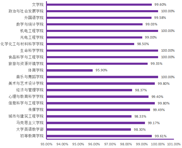 各院(部)的开课数、开课门次、班级数、教师数(人次)、学生数(人次)和学生上课率情况如下图所示: