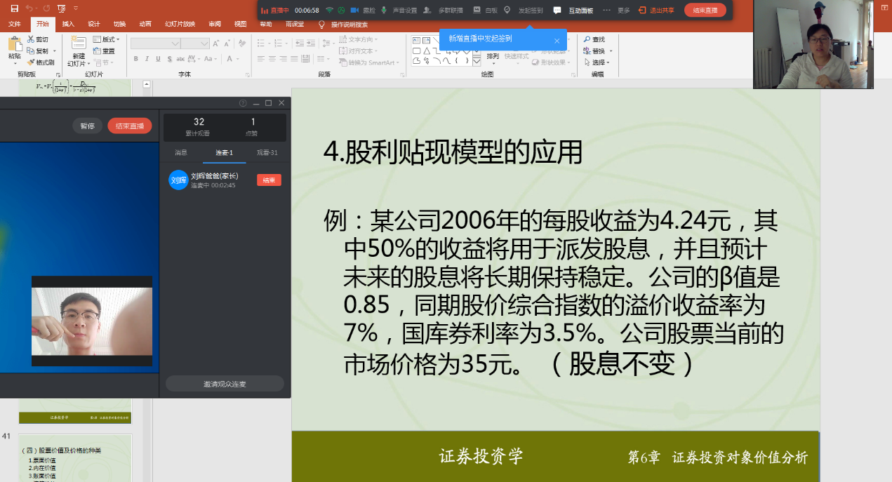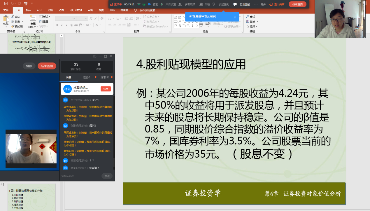 由于疫情的影响,经济与管理学院刘晓蕾老师先建立了班级微信群,以便及时下达消息及文件。在授课时,刘老师选择了钉钉平台进行《证券投资》课程及《证券投资模拟》课程的授课。通过钉钉直播课堂,课前可以及时提醒学生上课,课中能够与学生实时互动,课后配合长江雨课堂的使用进行章节测验,迅速掌握学生的学习状态,以达到良好的教学效果。