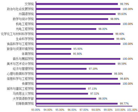 各院(部)的开课数、开课门次、班级数、教师数(人次)、学生数(人次)和学生上课率情况如下图所示:
