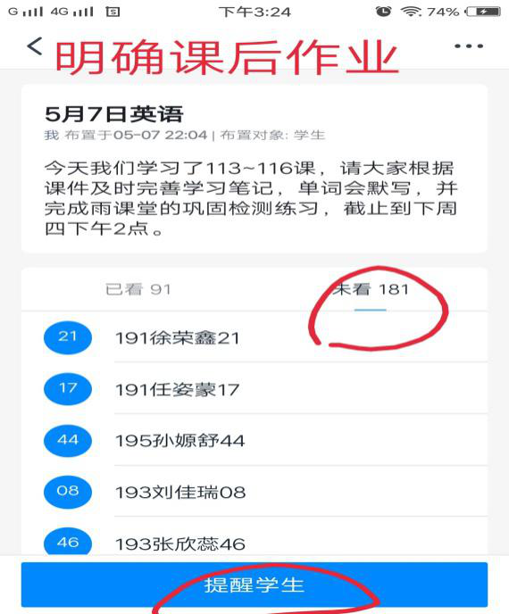 一、授课前,通过雨课堂发布预习课件,课件主要包括本周新授课要学习的单词讲解和课文阅读并辅以检测,预习课件中明确要求,让大家心中有数。发布预习任务后,及时通过QQ群和雨课堂教学日志的形式发布提醒。发布作业之后,还需要提醒学生,因为每次上课总有几个同学不能在规定时间内完成,然后解释说自己忘记了,因此一遍遍的督促很有必要。