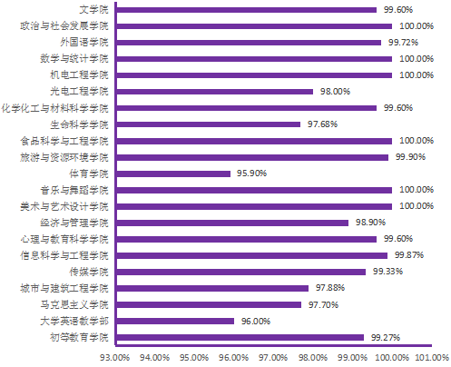 各院(部)的开课数、开课门次、班级数、教师数(人次)、学生数(人次)和学生上课率情况如下图所示: