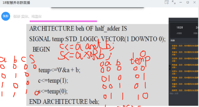 网上教学,没有办法利用板书书写和画图。因此,在课件中编辑和绘制了大量的公式、图片和动画效果以及视频,边讲解边动态化地进行演示,并且结合ppt的墨迹输入法和钉钉的白板功能,给学生进行习题的详细讲解,引导学生跟随老师的讲解思考、聆听,极大地吸引了学生的注意力,增强了网上教学的效果。另外,对于《EDA技术实验》,张老师采用了软件进行编写以及仿真。提前下载Quartus ii13软件,指导学生安装与使用,并且全面介绍相关理论知识,为开学进入实验室开展电路实践做好充分准备。