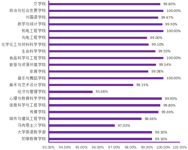 各院(部)的开课数、开课门次、班级数、教师数(人次)、学生数(人次)和学生上课率情况如下图所示: