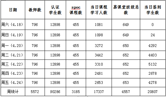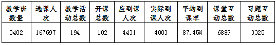 我校师生在雨课堂平台使用情况,根据大数据统计,由此查看本周教学班数量、教学活动总、开课总数、应到课人次、实际到课人次、课堂互动总数、平均到课率、习题互动总数,详情见下表: