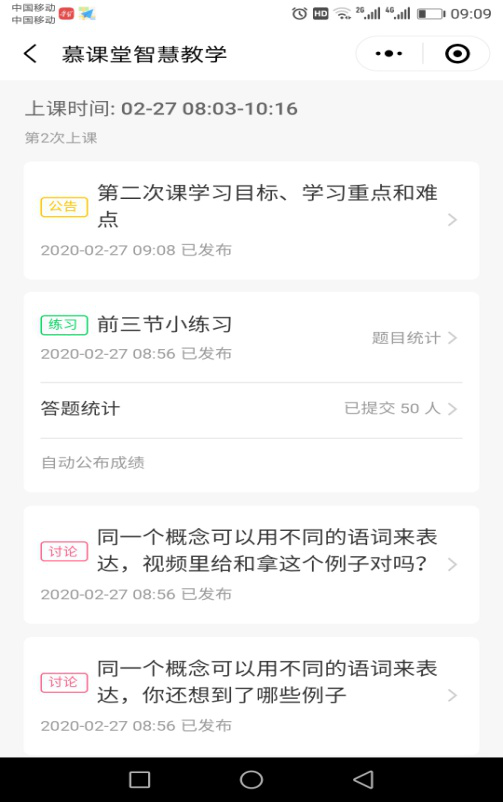 在课程教学中,我们基本都形成了自己的教学流程,摸清了教学的过程。通识课教学,普通话口语教程这门课,基本是微信群、qq群预热,提醒同学何时进入慕课堂,进入慕课堂的重点,整个课程的流程是什么,然后在慕课堂进行练习、问卷的完成,然后认真阅读公告,阅读第二章学习重点,最后进入慕课学习,并完成单元测验。《对外汉语教学概论》采用钉钉直播的方式进行线上教学,按照“签到—复习旧课—讲授新课—小结—课堂测试—整理笔记”几个环节展开展开。
