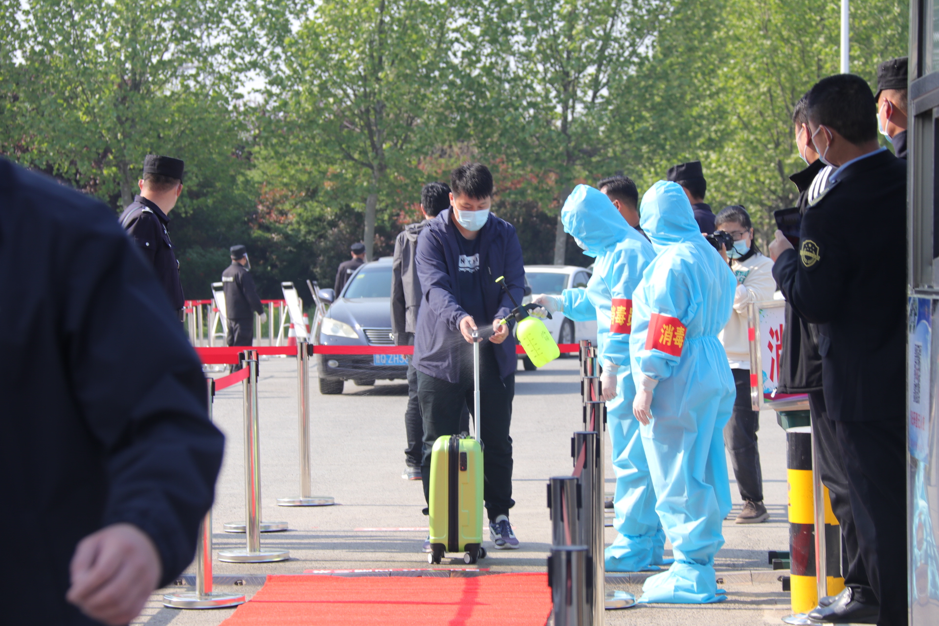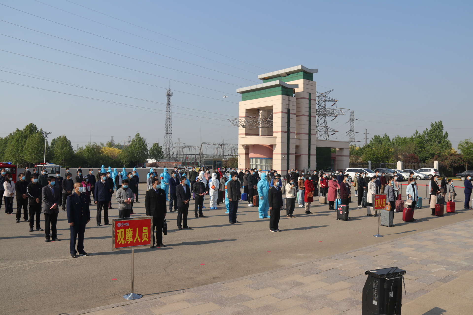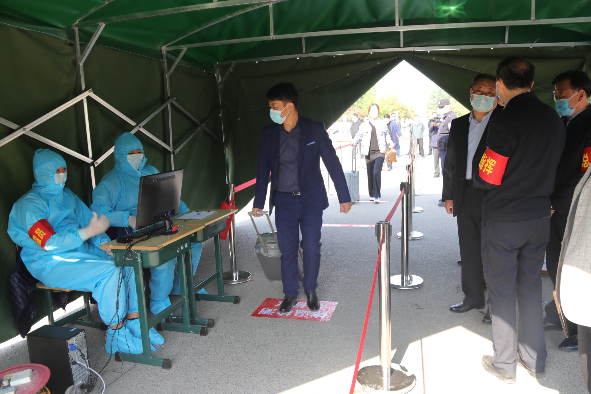 随后,学校疫情防控演习总指挥、校党委书记曹胜强宣布演练正式开始。此次疫情防控应急处置演练共设置了学生入校、学生上课、宿舍管理、食堂就餐等场景。学校分别在各相关场所设置了回形隔离等待通道、醒目标识和留观点,并组织开展了相关场景的正常流程演练和突发情况的应急处置演练。演练过程中,工作人员穿戴防护服和口罩进行引导、消毒等工作,演练老师有序排队完成进校、进宿舍等流程。工作人员恪尽职守,认真维持现场秩序;演练人员积极配合,严谨还原开学场景;领导到场观摩,监督演练顺利进行。活动现场秩序井然。