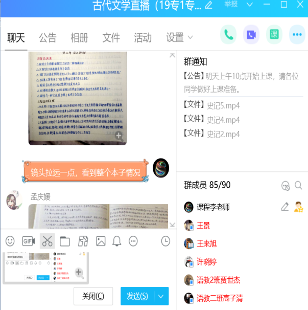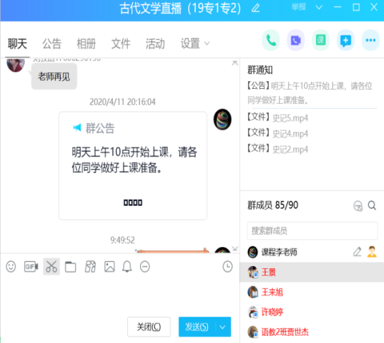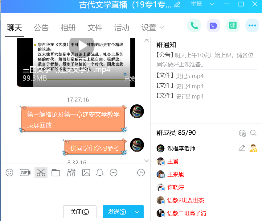 文学院李思华老师本学期承担了2019级专1专2的《古代文学2》(秦汉魏晋南北朝文学)课程。该课程是一门专业基础课程,也是中文类专业的一门核心课程、必修课程、考试课程,非常重要且内容较多。为切实落实教育部“停课不停学”的号召,我们开展了网上授课,利用“微信群+QQ直播+录屏”开展网上混合教学,努力实现高质量网络授课。具体工作如下: