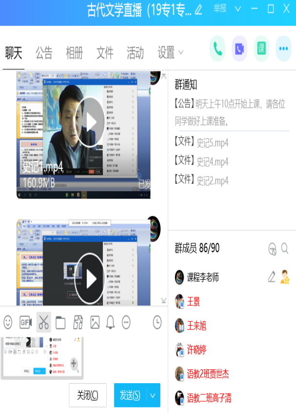 QQ直播(加录屏回放)的方式可以督促学生对于学习薄弱环节或偶有迟到情况也可以采用观看回放的方式进行重复学习。下图为通过录屏回放上传的讲课视频: