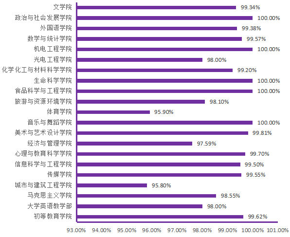 各院(部)的开课数、开课门次、班级数、教师数(人次)、学生数(人次)和学生上课率情况如下图所示: