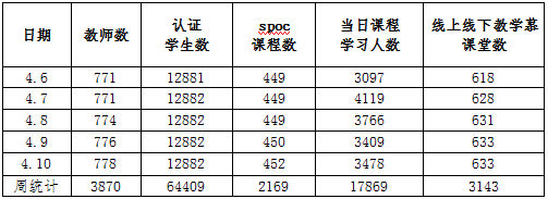 本周运行课程累计2169门次,上线教师数3870人次,认证学生数64409人次,当日课程学习累计17869人次,线上线下教学慕课堂数3143。