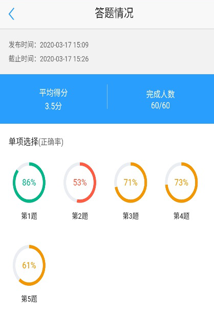 其一,在上课过程中,根据本次课学习目标,在U校园上发布测试题,根据教学时间手动开始与结束,并通过U校园教师端统计每道题的错误率,在课上有针对性的进行讲解。