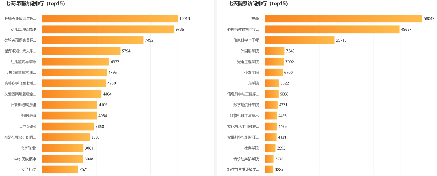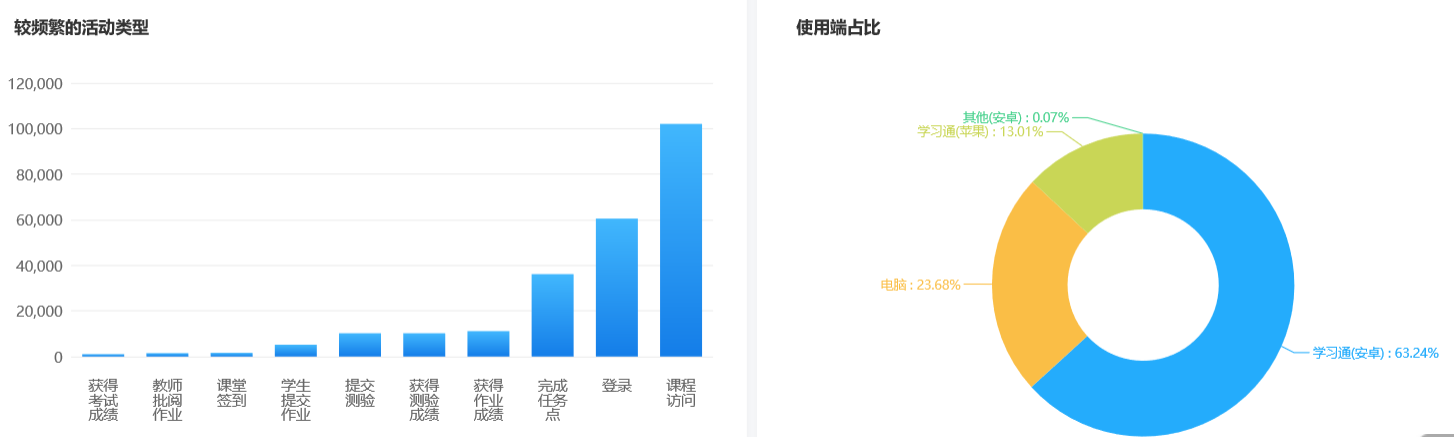 根据超星平台提供的大数据分析,可以查看本周课程打开次数、课程访问排行、较为频繁的活动类型、活跃度最高的院系和学习端口占比分别为:
