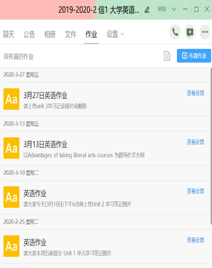第三,要求学生在线上课堂学习中记笔记,并在每单元课程学习后,要求学生通过QQ群作业上传单元学习笔记,不仅可以起到督促学习的作用,也帮助学生养成良好的学习习惯。