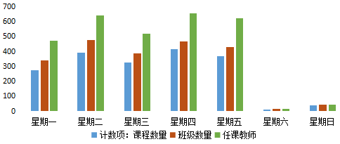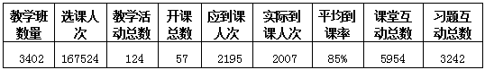 我校师生在雨课堂平台使用情况,根据大数据统计,由此查看本周教学班数量、教学活动总、开课总数、应到课人次、实际到课人次、课堂互动总数、平均到课率、习题互动总数,详情见下表:
