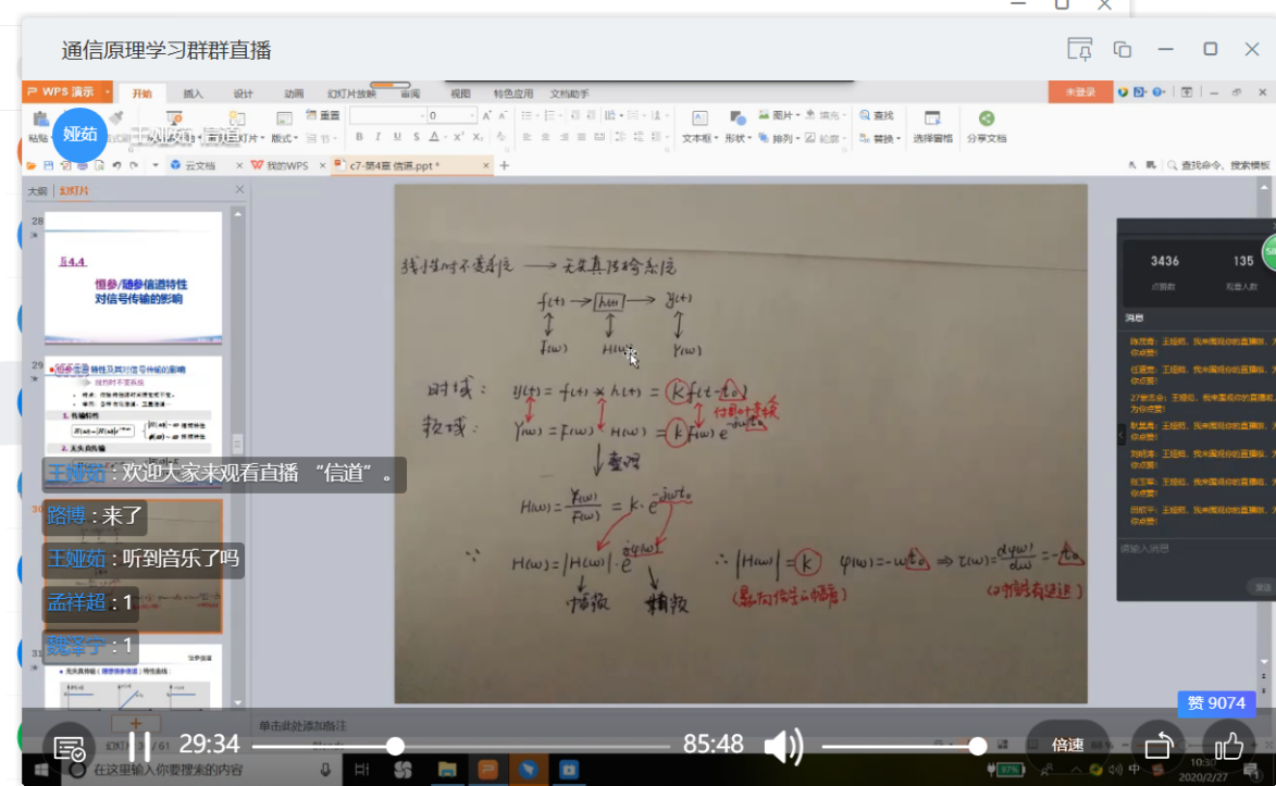 《通信原理》课程的线上教学进展顺利,与学生的配合密不可分,令人欣慰的是绝大多数同学在家中能够自觉认真的按照老师要求进行学习,认真做笔记,积极完成作业。下一步为了掌握学生线上学习效果,拟定在三个教学班中开展“阶段性检测”,做好开学后线下教学与线上教学的衔接。