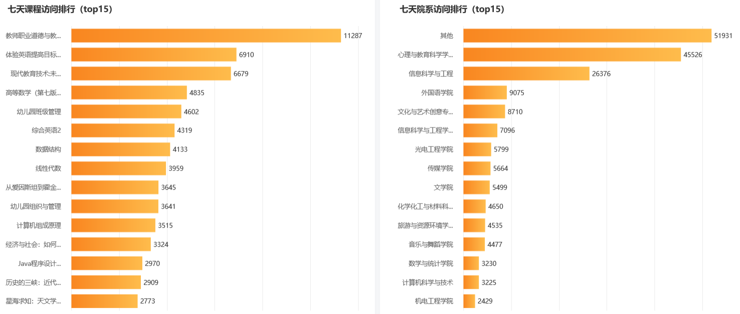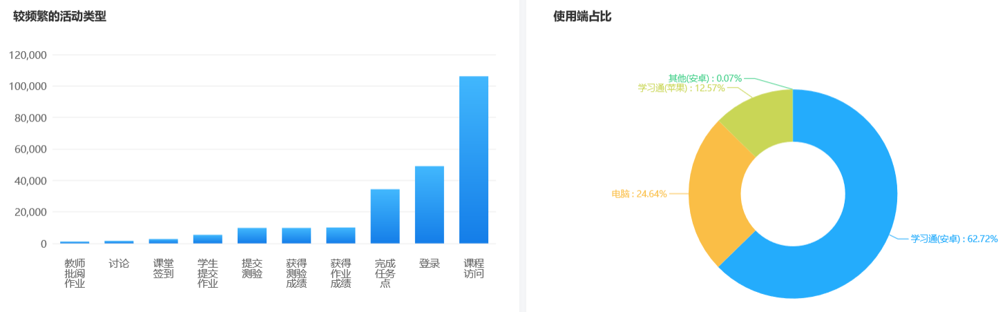 根据超星平台提供的大数据分析,可以查看本周课程打开次数、课程访问排行、较为频繁的活动类型、活跃度最高的院系和学习端口占比分别为: