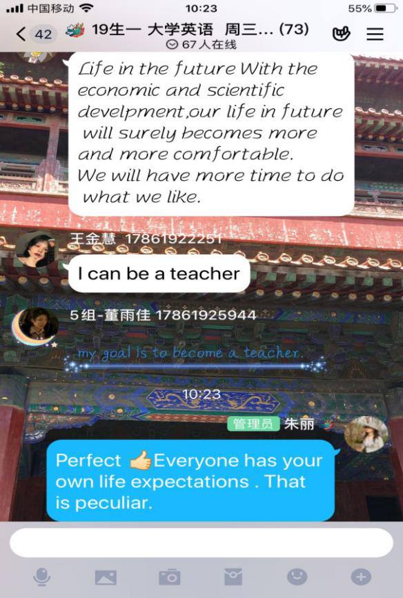 这就是我线上授课的基本方式和方法。总结下来就是借助MOOC平台、QQ平台、U校园平台,利用任务型教学法和小组合作学习等教学方法,尽量做到学习内容适合,监管学生到位,保证学习时间和学习效率,以“上好课”为初衷,以提升学生的英语听说读写能力为目标,做好老师的本职工作。当然,我相信同事们会有更适合的、更好的方法一起分享。我相信没有最好只有更好。