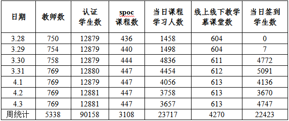3月30日-4月5日,线上教学课程1086门、3102门次;参与授课教师813人,涉及教学班级2228个,学生学习人次数165730;累计上线学习学生人次数占累计应上线学习人次数比例为99.38%。