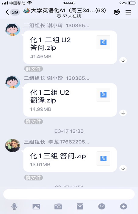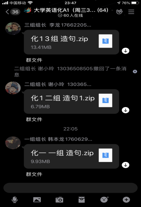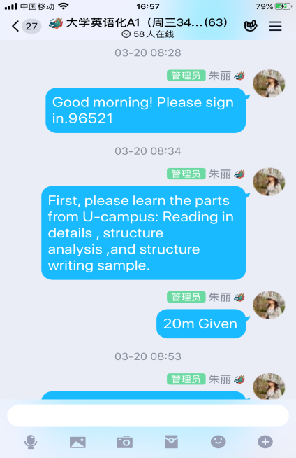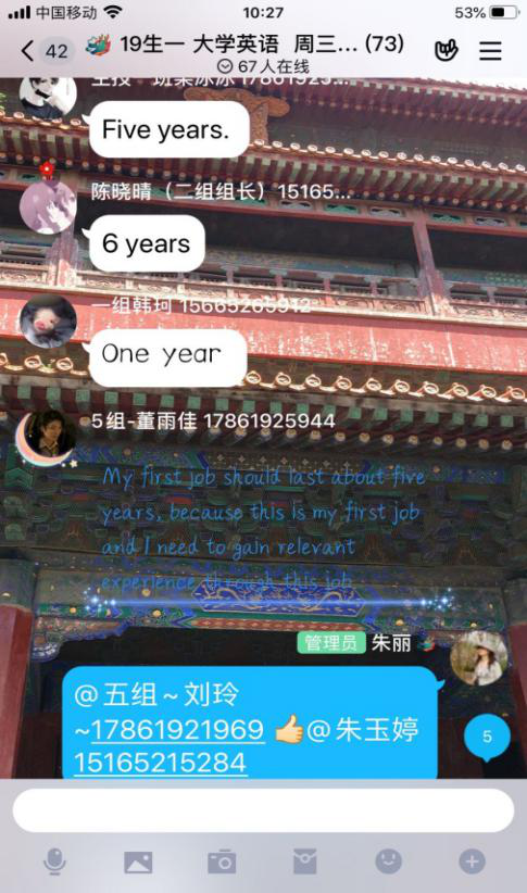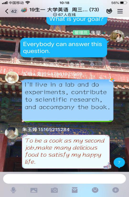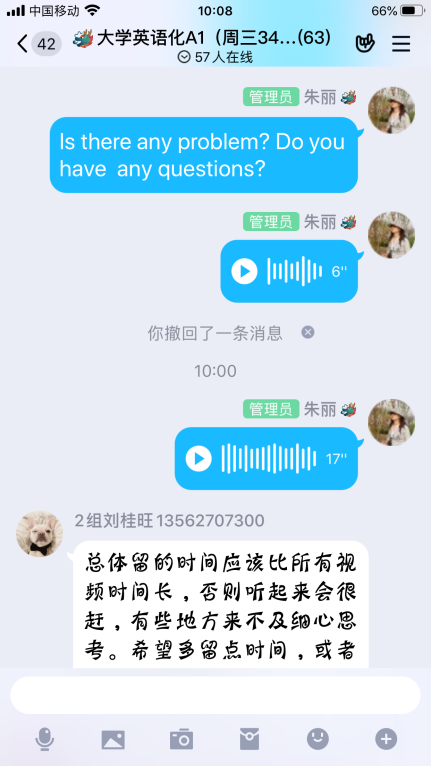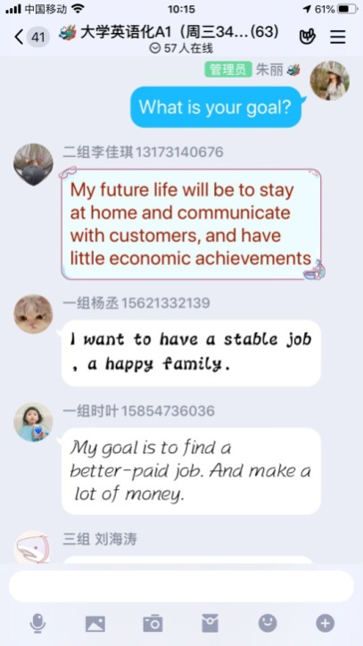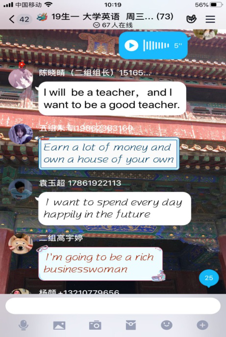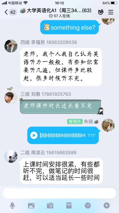 那么,“说”的问题如何在线上保证呢?课上,设置任务,对个别同学进行提问,让他们以发送语音的方式,检测他们听课的效率,并可以及时纠正发音。课下,布置说的练习,各小组在各自组群里进行实时话题讨,以小组为单位进行录音并传送给老师,邀请个别组在一定时间和老师线上沟通答疑。