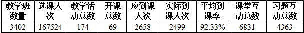 我校师生在雨课堂平台使用情况,根据大数据统计,由此查看本周教学班数量、教学活动总、开课总数、应到课人次、实际到课人次、课堂互动总数、平均到课率、习题互动总数,详情见下表: