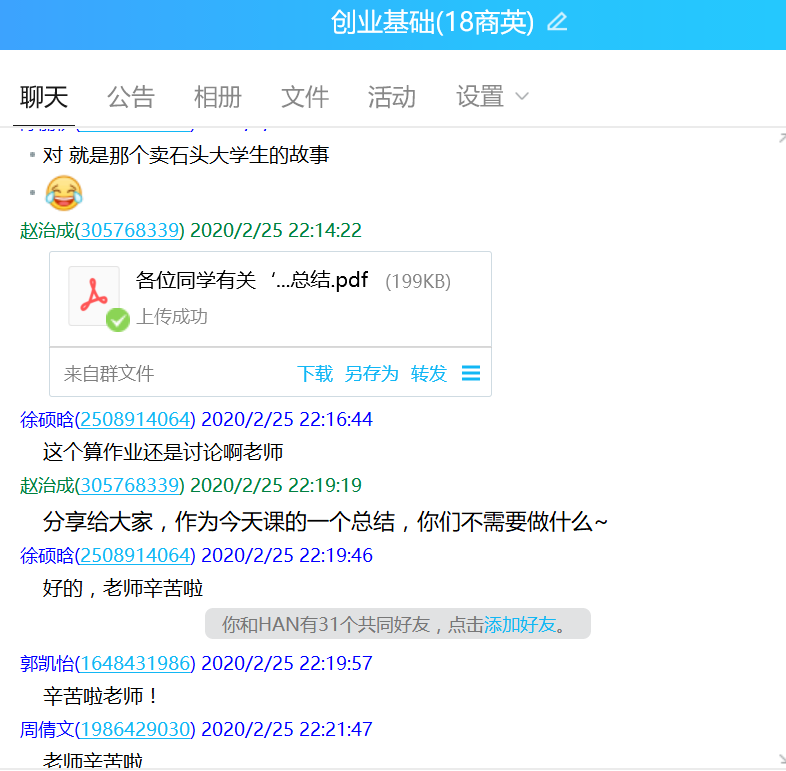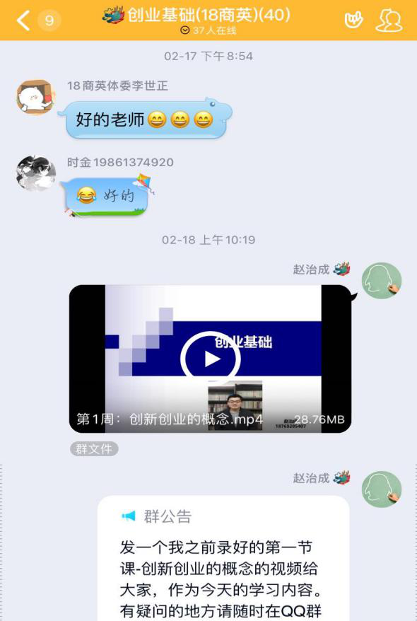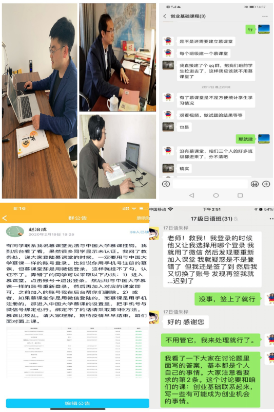 开课前,负责本门课程的赵治成、孟冬永、冯振老师共同组成《创业基础》课程团队,确定了以中国大学慕课的异步SPOC为中心,开展线上教学的思路。同时,建立了班级QQ群,在群里进行了详细的说明与答疑,确保每位同学掌握使用要领。