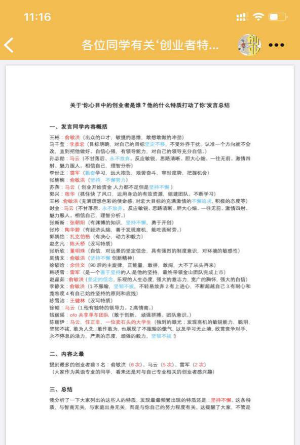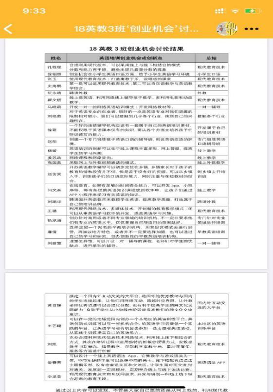 下课以后,将同学们在群里的发言进行总结与整理,并发回群里与同学们分享,给予反馈,由此让同学们感受到自己的发言被重视,从而进一步提高今后参与课堂讨论的愿望,形成良性循环。