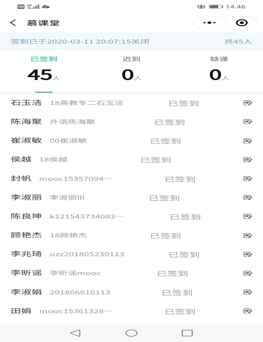 使用慕课堂的签到功能,实时掌握学生的签到情况。如果有学生一直未签到,则会单独与其联系,确保所有学生准时学习。