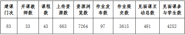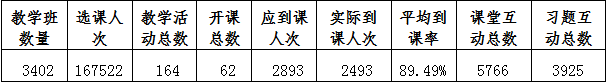 我校师生在雨课堂平台使用情况,根据大数据统计,由此查看本周教学班数量、教学活动总、开课总数、应到课人次、实际到课人次、课堂互动总数、平均到课率、习题互动总数,详情见下表: