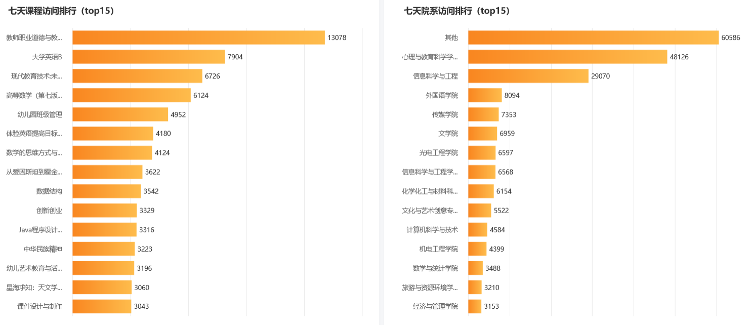 根据超星平台提供的大数据分析,可以查看本周课程打开次数、课程访问排行、较为频繁的活动类型、活跃度最高的院系和学习端口占比分别为: