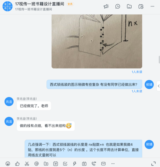 二、在理论讲授阶段,任课教师采用了录播与直播相结合的方式,这是根据不同的课程内容来设计的。如在讲授书籍各种的装订方式的时候,需要学生根据教师提供的步骤图去动手制作,这时如果直播授课时间太长,学生想回放去找到某一个装订形式的结构就比较困难,所以教师在教学设计中就采用录播的形式,以便于对每一个装订形式进行分段剪辑,这样学生看得清晰直接,学习效率大大提高。书籍的基本结构的讲解亦是如此。同时,教师针对知识点中难点进行直播教学,对学生的出现和提出的问题及时进行线上答疑。