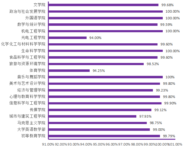 各院(部)的开课数、开课门次、班级数、教师数(人次)、学生数(人次)和学生上课率情况如下图所示: