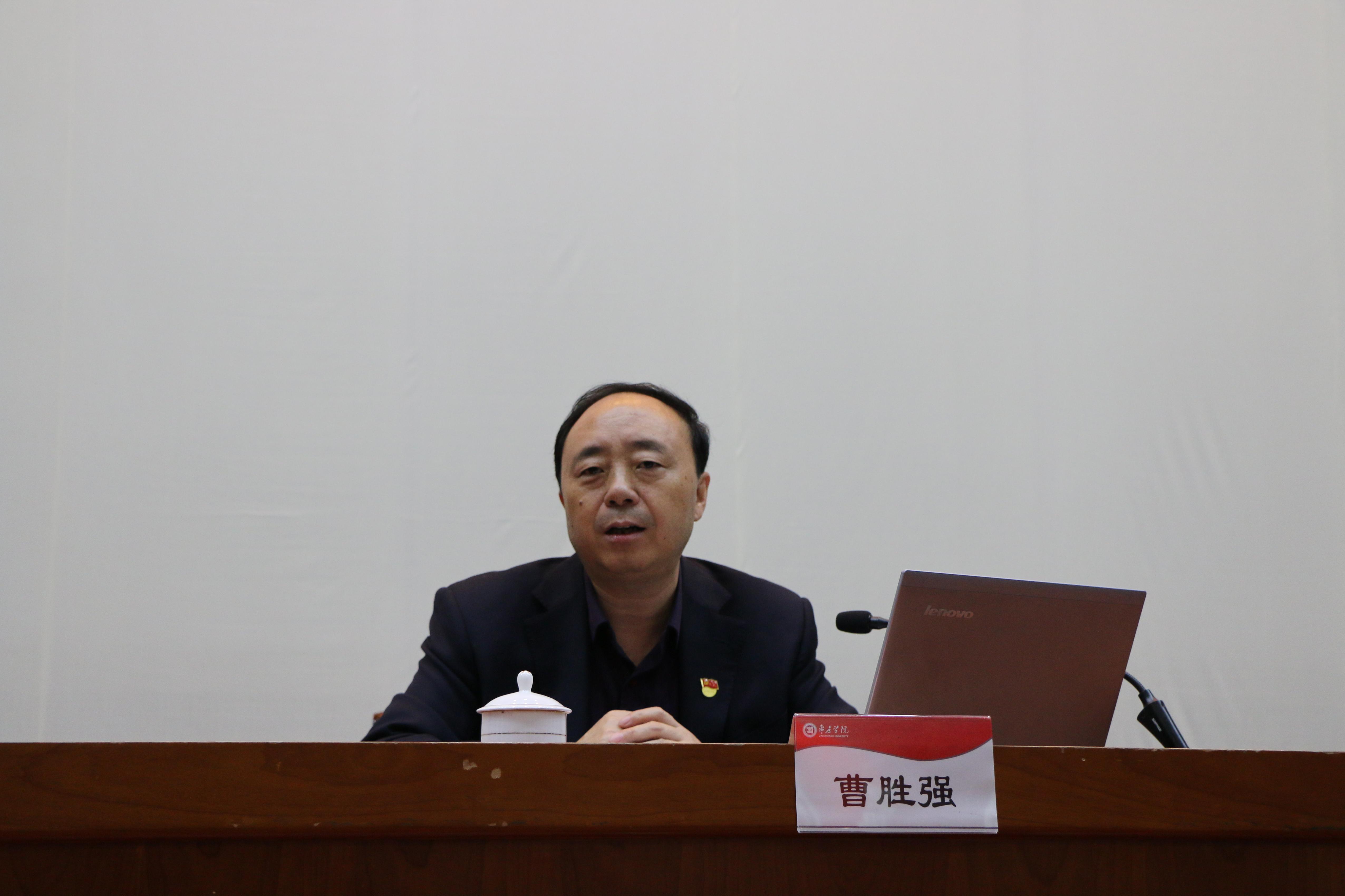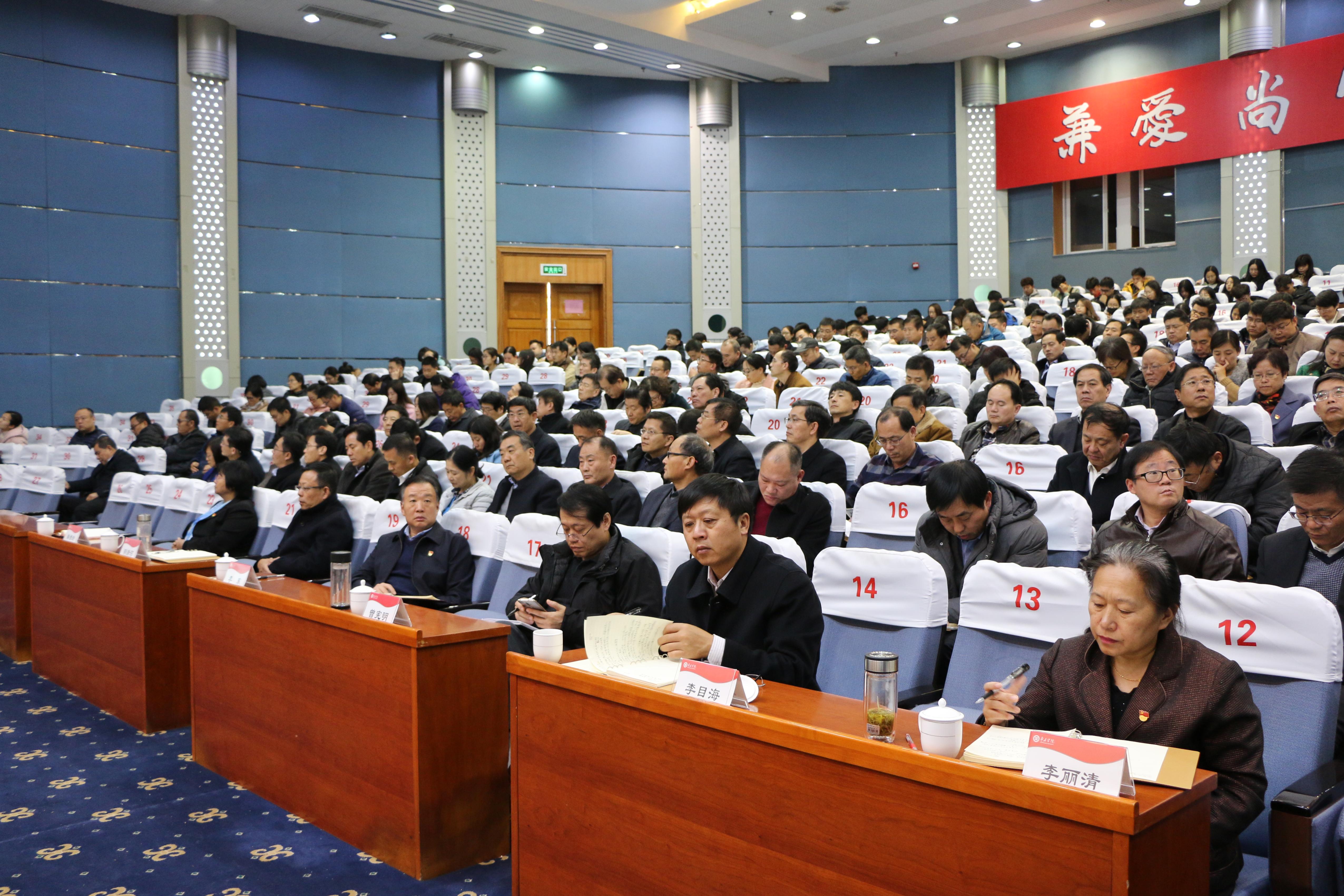 11月28日下午,我校在综合楼报告厅举行党的十九届四中全会精神宣讲报告会。校党委书记、省属高校宣讲团成员曹胜强作了题为《坚定制度自信、增强行动自觉,扎实做好高校立德树人根本任务》的宣讲报告,校领导李东、曾宪明、明清河、李目海、韩素玲、李丽清出席报告会,全校副科级以上干部到会聆听。