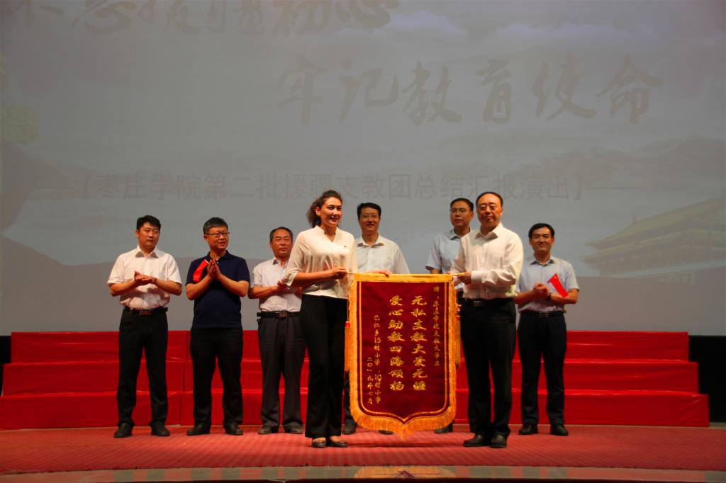 总结大会对援疆支教师生进行了表彰。崔升平宣读表彰决定,我校4名带队教师和201名支教学生分别被山东省援疆工作指挥部、喀什地区教育局评为支教优秀带队教师和支教优秀大学生。会上,疏勒县8所受援学校向我校赠送了锦旗,以表达对我校支教团的谢意。