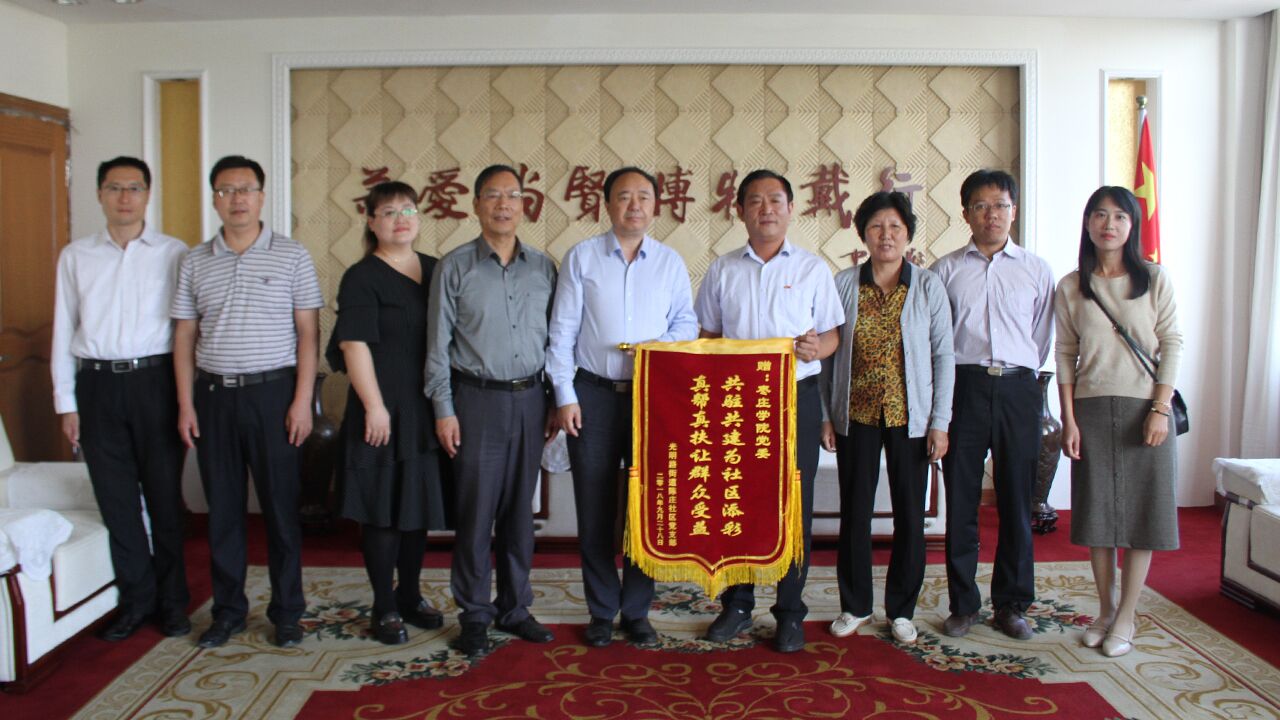 潘超首先对近一段时间以来我校在陈庄社区铁道游击队义和炭场展室设计规划等工作上给予光明路街道的指导帮助表示感谢,对我校师生党员为陈庄社区群众开展的系列志愿服务表示赞赏。希望学校继续发挥人才资源优势,对街道今后的经济文化建设多提指导意见,多安排大学生开展志愿服务,帮助街道社区提升管理服务水平,提升市民文明程度。然后,潘超代表市中区光明路陈庄社区党支部向我校党委赠送了题有“共驻共建为社区添彩真帮真扶让群众受益”文字的锦旗,曹胜强代表校党委接受锦旗。