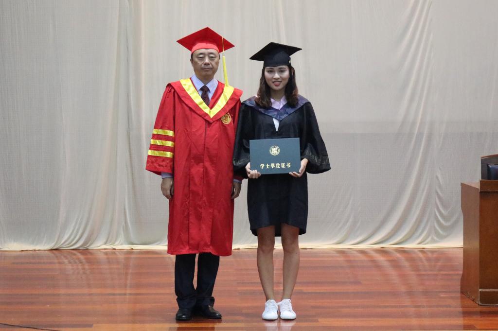 在雄壮的国歌声中,学士学位授予仪式正式拉开帷幕。校党委书记曹胜强教授与毕业生们一一握手,正冠拨苏、颁发学位证书、合影留念,并送上诚挚祝福。现场同学们用热烈的掌声表达心中的喜悦与激动,共同见证人生中这个庄严而又欢乐的时刻。
