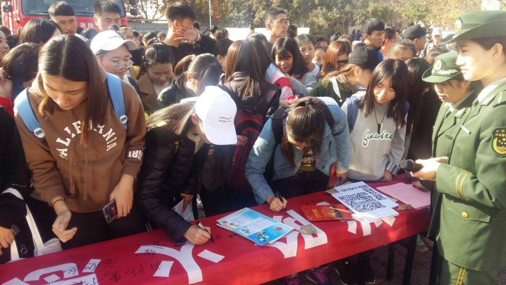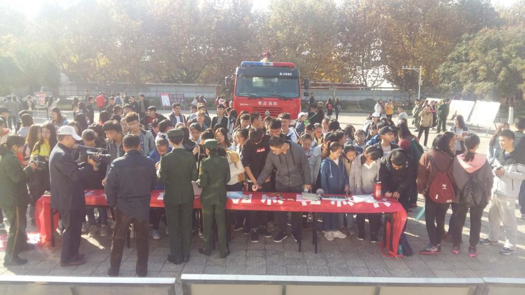 11月9日,保卫处联合市中消防大队在小广场举办消防宣传活动。消防官兵向师生们发放宣传材料,讲解消防知识,参加活动的同学纷纷在横幅上签名承诺;同时,保卫处、学生处组织宏泰物业全体保安、公寓管理人员、保洁人员及部分学生进行了灭火、救援、逃生等演练活动,通过演练,掌握了灭火器的使用方法,增强了扑救初起火情的能力。