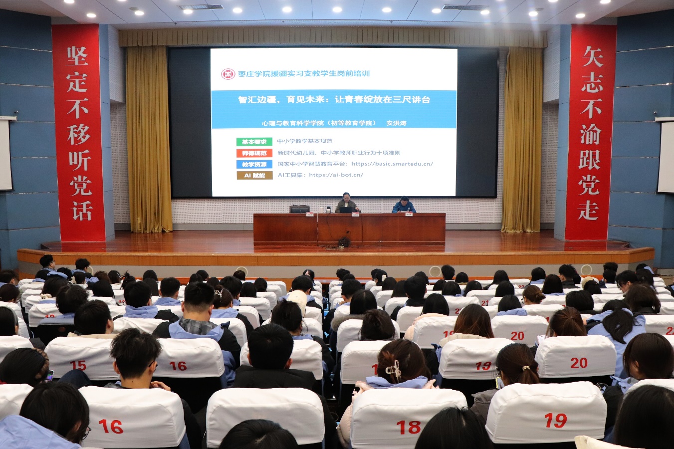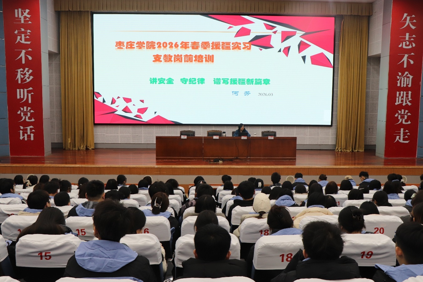 3月8日,我校在市中校区综合楼报告厅举行2026年春季援疆实习支教团岗前培训会,205名支教团师生参加会议,支教团带队教师郝荣耀主持会议。
