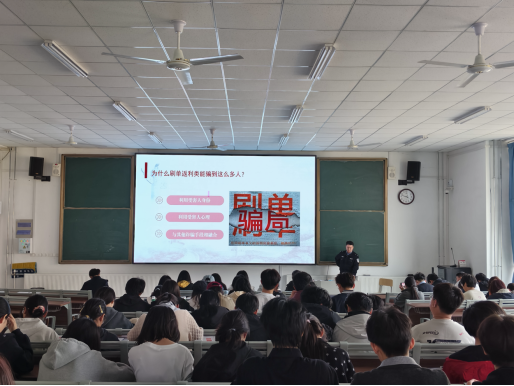 为筑牢校园反诈安全防线,守护学生财产安全,近日,枣庄市公安局薛城分局沙沟派出所民警受邀走进数学与统计学院,在薛城校区崇德楼110室开展“反诈第一课 宣讲进校园”专题宣讲,学院200余名学生参加。